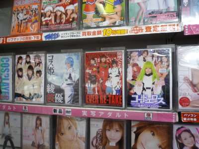 Eu também consegui tirar foto da pratelereira de filmes pornos, já que me pediam pra ver se era verdade que no Japão um dos destaques são filmes feitos a partir de animes, portanto garotas vestidas de cosplay dos personagens de anime na moda.