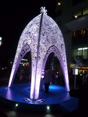 Aqui tinha uma atração que fazia fila que era um efeite de natal imenso, aonde uma maquina desejava sorte para os casais. Eu e o Renato chegamos a pensar em zuar e entrar na fila, mas acabamos não fazendo, tirando foto só de distância. Mas que seria engraçado, dois gaijins na fila lá, pra ver a sorte do amor, seria.