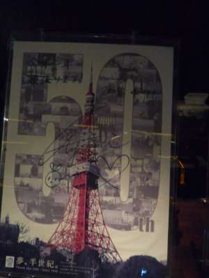 Também tirei foto de um poster da torre, autografado pela cantora Ayumi Hamasaki. Estava sendo exibido no primeiro andar. Pena que não é todo mundo que goste de jpop, por isso não entenderá a importancia da visita nela em 2008, que foi a comemoração dos 50 anos da Tokyo Tower.