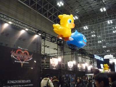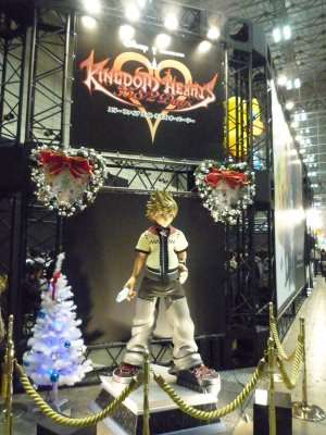 Fomos depois no stand da Square Enix, e os preparativos era pro jogo novo no DS de K. Hearts. O stand chamava a atenção, principalmente com o telão passando duelos do jogo Dissidia para PSP.