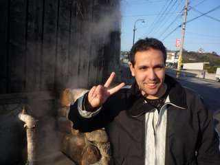 Descemos perto do Onsen e acabamos nos perdendo dando varias voltas em círculo na montanha, até finalmente conseguirmos achar o Onsen. Irônico que as calçadas soltavam vapor, e logo vimos um Akita solto deitado na calçada. Realmente é um cachorro lindo e nunca vi essa raça no Brasil.