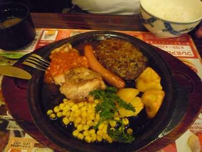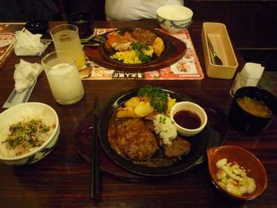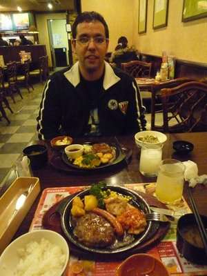 Como a madrugada é uma criança, ficamos andando por Nagasaki, pra conhecer a cidade. Fomos jantar um restaurante que descobrimos quanto entramos que era formato “Family Smart”, onde o Renato pediu um prato “a brasileira”, que veio frango e salsicha. Uma das coisas que eu gosto desses restaurantes é bebida a vontade de qualquer tipo, numa mesa que você se serve, e como eu adoro Fanta Melon, nossa foi ótimo. Eu pedi carne, pq já estava em abstinencia em comer carne, então vinha um bife mais um hamburguer pra compensar a escassez de carne no Japão. Um prato gostoso, mas que seria bem irônico no Brasil.