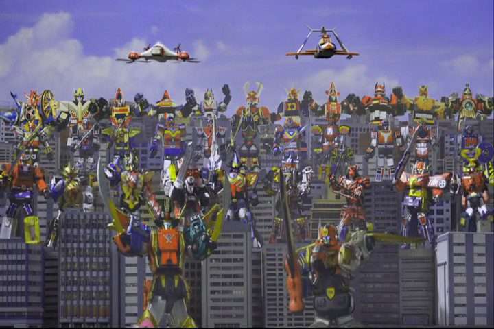 A começar pelo respeito aos sentais antigos. ok, não dá pra homenagear decentemente todos os 34 grupos mas souberam usar as pequenas aparições deles para que cada fã reconhecesse seus personagens ali. e usaram bem as características e estilo de luta dos grupos como mostrar os dois Vermelhos dos Sentais que usam a temática ninja (Hurricanger e Kakuranger) lutando lado a lado.E pelo lado do fã brasileiro, as rápidas(e põe rápidas nisso) aparições de Changeman,Flashman,Maskman e Goggle V servem pra ativar aquele gatilho de nostalgia e fazer vibrar.