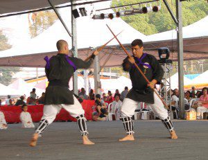 Outra arte nativa de Okinawa, o kobudo – que utiliza armas e ferramentas de trabalho agrícola adaptadas – foi mostrada ao público pelos alunos da Associação Okinawa Kobudo Jinbukai do Brasil, também comandada pelo sensei Flavio Vicente.