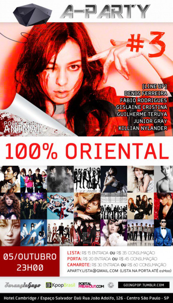 A-Party tocará os maiores Hits do J-POP, K-POP e C-POP. Koda Kumi, BoA, After School, B2ST, MBLAQ, GIRLS’ GENERATION, U-KISS, BIG BANG, 2NE1, MiCHi, Crystal Kay, 4Minute, Super Junior, TVXQ, EXO, B.A.P. entre outros…
