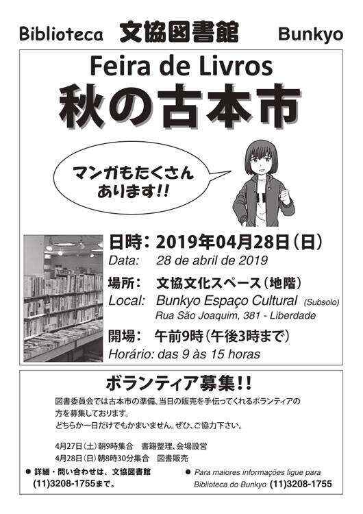 A feira irá ocorrer no domingo, dia 28 de abril, das 9h às 15h, sendo um evento muito aguardado. Toda a venda de material na feira é revertido na manutenção da Biblioteca do Bunkyo. Montada no Espaço Cultural da entidade, a Feira reúne livros usados doados por leitores associados, apoiadores e empresas japonesas.