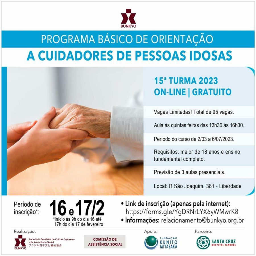 O Programa Básico de Orientação a Cuidadores de Pessoas Idosas – 15ª Turma – 2023 é uma atividade gratuita e oferece 95 vagas (ressaltamos que em caso de desistência, a vaga será repassada ao próximo da lista de espera). Realizado pela Sociedade Brasileira de Cultura Japonesa e de Assistência Social – Bunkyo com o apoio da Fundação Kunito Miyasaka e do Hospital Japonês Santa Cruz.