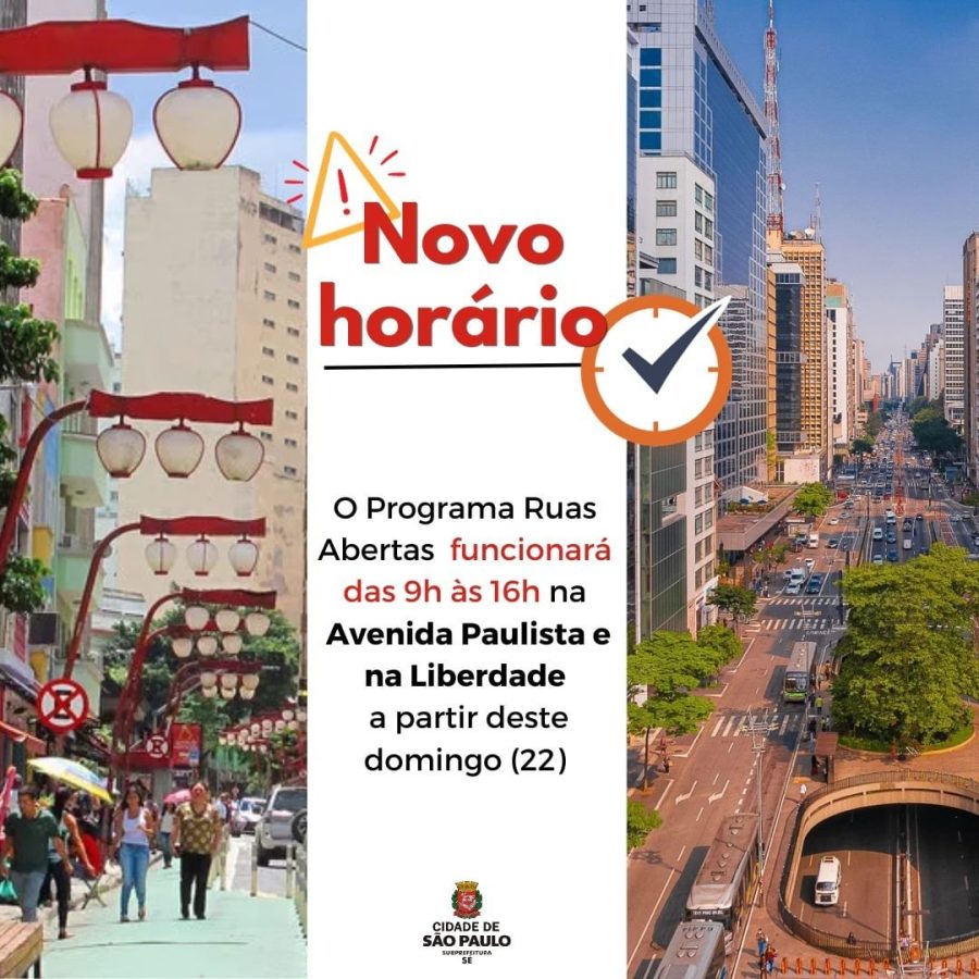 Desde o último domingo, dia 22 de outubro, o programa Ruas Abertas foi reajustado pela prefeitura de São Paulo. Tendo originalmente horários diferentes, a Avenida Paulista e o Bairro da Liberdade foram padronizados para 9 horas da manhã até 16 horas da tarde.