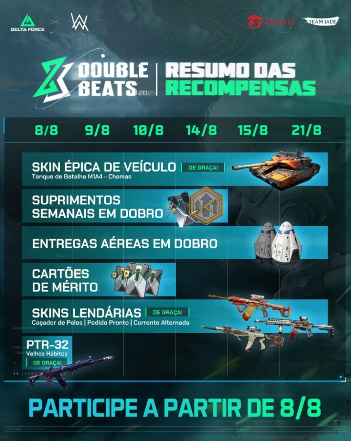 Entre 8 e 21 de agosto, o evento Double Beats promete movimentar o jogo com várias recompensas para quem entrar na partida. Os jogadores podem resgatar o código AW88PTRR2K e garantir a skin épica PTR-32 – Velhos Hábitos, uma arma exclusiva da parceria, disponível por tempo limitado.