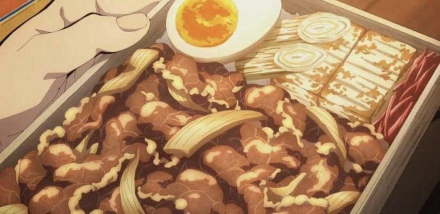 No arco do Trem Infinito, ninguém esquece de Rengoku devorando bentôs sem parar. A tradicional marmita japonesa é retratada como combustível para o Pilar das Chamas, que ainda incentiva Tanjiro, Zenitsu e Inosuke a comerem também. Mais do que um momento divertido, esse prato mostra como a comida é parte da preparação antes da batalha.