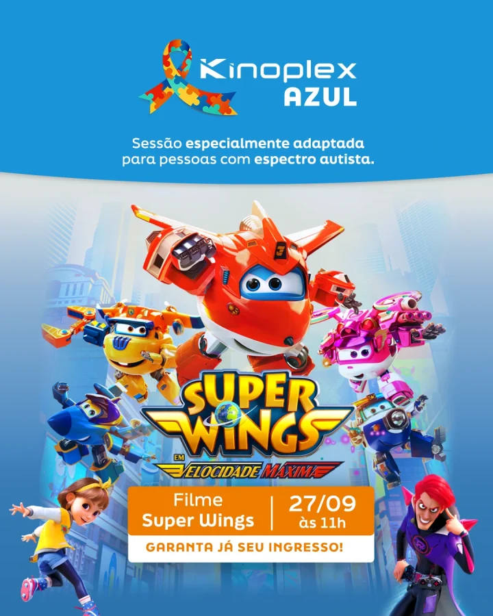 O Kinoplex dá continuidade ao projeto Kinoplex Azul, iniciativa que transforma a experiência de ir ao cinema em algo mais acessível e acolhedor para crianças, jovens e famílias no espectro autista. A próxima sessão acontece no dia 27 de setembro (sábado), às 11h, em cinemas selecionados, com a exibição de “Super Wings em Velocidade Máxima”.