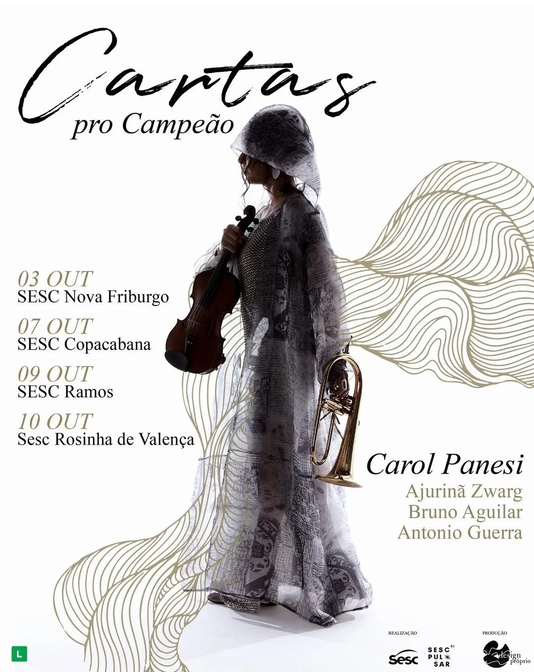 A multi-instrumentista e compositora Carol Panesi apresenta “Cartas pro Campeão”, espetáculo inspirado em obras inéditas de Hermeto Pascoal. A pedra fundamental do show surgiu a partir de uma correspondência recebida do próprio mestre durante a pandemia. Das 33 partituras enviadas, Panesi selecionou cinco para compor o repertório, retribuindo a generosidade de Hermeto com arranjos próprios que mesclam improviso, brasilidade e virtuosismo.