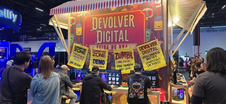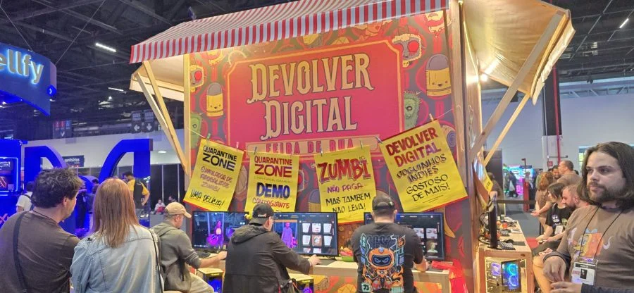 Com um estande que lembrava uma barraca de feira, a Devolver Games trouxe quatro títulos inéditos: BALLxPIT, Forestrike, Skate Story e Quarantine Zone. Nove estações de teste garantiram atenção constante do público, consolidando a empresa como destaque no cenário indie.
