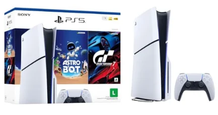 O PS5 Slim Edição Digital, que acompanha Astro Bot e Gran Turismo 7, tem preço reduzido de R$ 3.999,90 para R$ 2.999,90. A versão PS5 Standard com leitor de disco e dois jogos aparece por R$ 3.499,90.