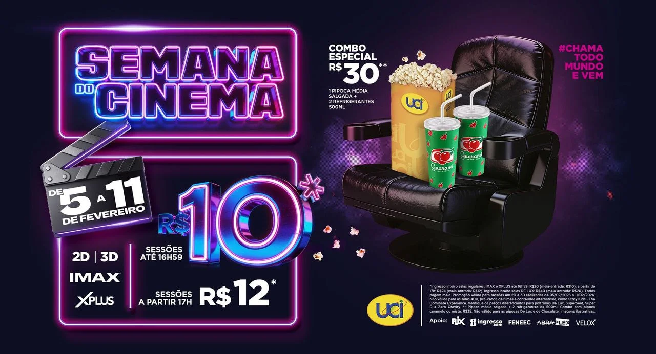 Entre 5 e 11 de fevereiro, a UCI Cinemas participa da Semana do Cinema com preços reduzidos em praticamente toda a rede. A campanha nacional garante ingressos a partir de R$ 10, inclui salas especiais como IMAX e XPLUS e ainda derruba o valor das salas UCI DE LUX para R$ 20, em qualquer horário.