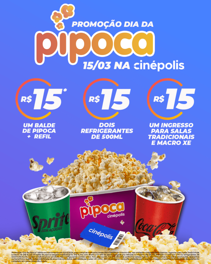 A promoção vale para todas as unidades da rede no Brasil e inclui sessões em salas tradicionais e também no formato Macro XE. Na prática, é aquele tipo de campanha que tenta trazer o público de volta para a experiência completa do cinema, com direito ao combo obrigatório: filme mais pipoca.