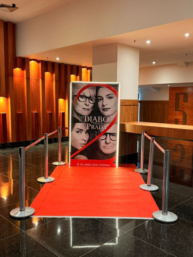 A proposta é transformar a sessão em uma experiência temática inspirada no universo da moda. No dia da pré-estreia, todas as unidades da rede recebem ambientação com tapete vermelho e iluminação especial, criando espaços voltados para fotos e interação do público.