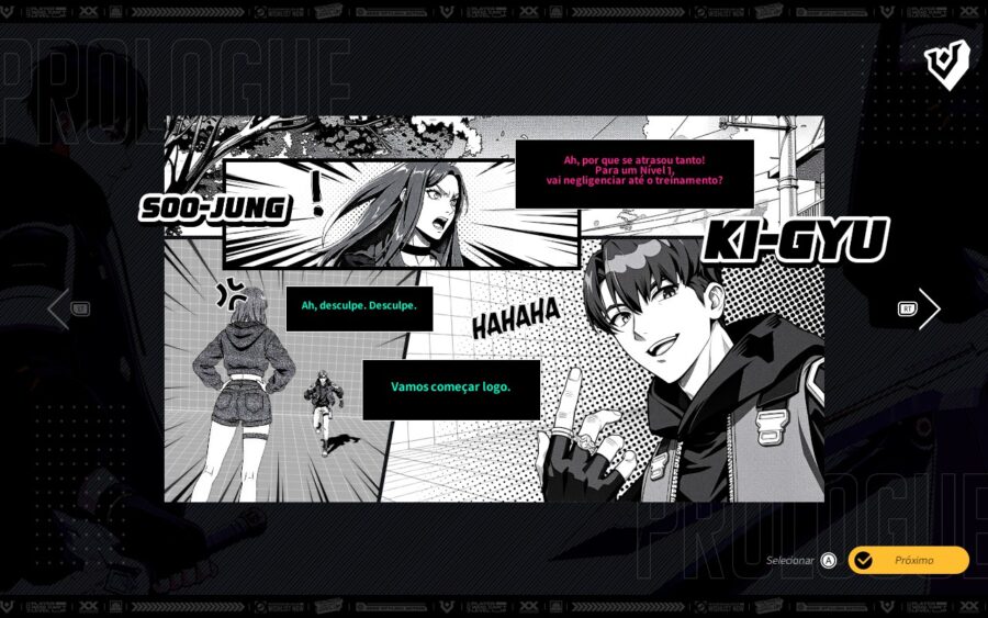 Aqui seguimos com Kim Ki-gyu em um pequeno tutorial antes de acessar os portais. O jogo apresenta um roguelite mais tradicional, com retorno constante ao Panteão, que funciona como ponto inicial da exploração.