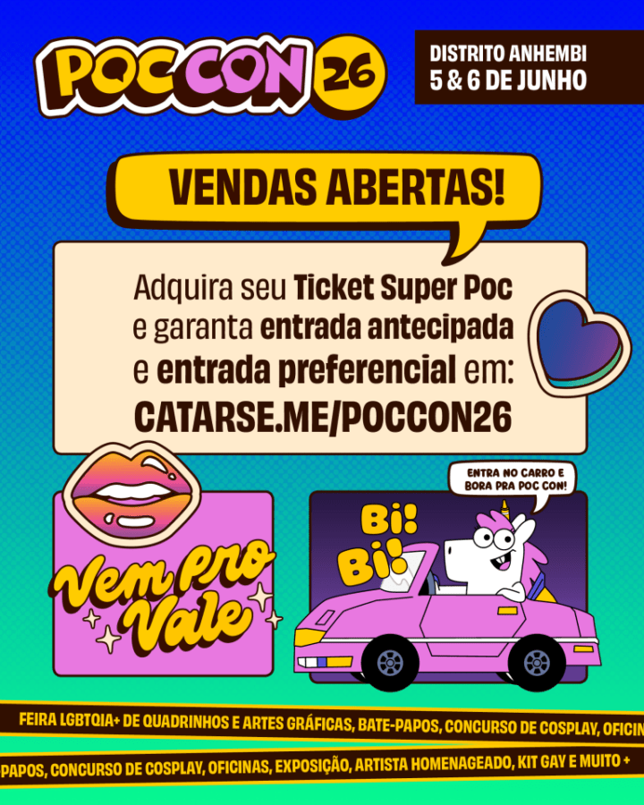 A PocCon 2026 já tem data marcada e chega maior. Considerada a principal feira LGBTQIA+ de quadrinhos e artes gráficas da América Latina, o evento acontece nos dias 5 e 6 de junho, no Distrito Anhembi, reunindo mais de 220 artistas expositores e uma programação voltada à diversidade criativa.