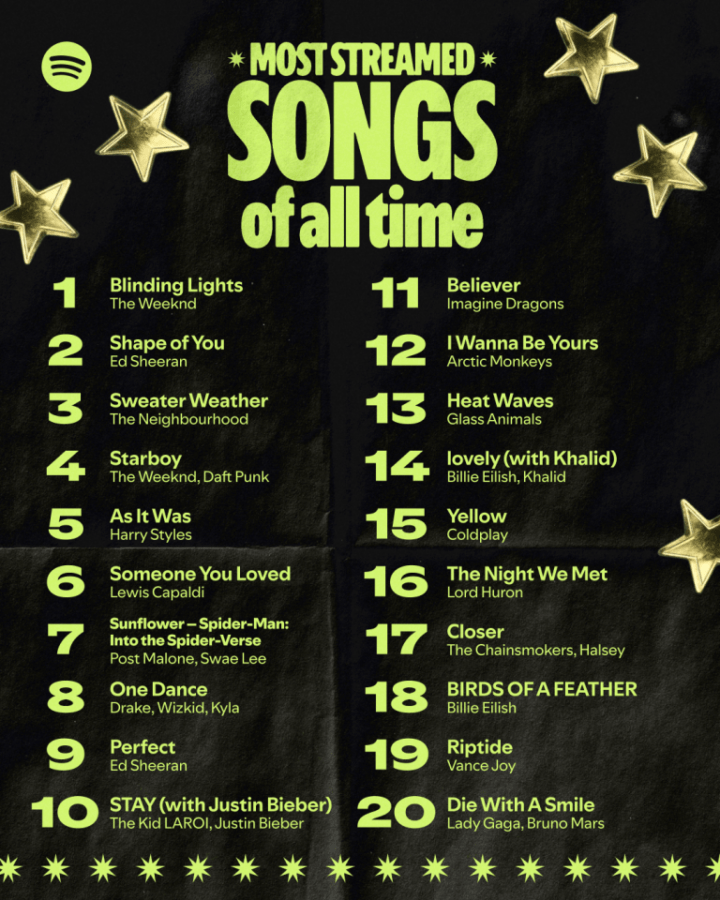 O topo das faixas mais reproduzidas pertence a “Blinding Lights”, de The Weeknd, seguida por “Shape of You”, de Ed Sheeran.